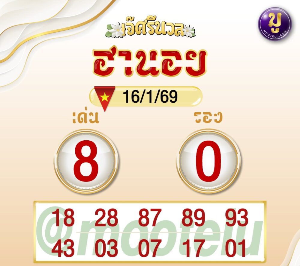 ชุดของเจ๊ศรีนวลงวดนี้โฟกัสชัดไปที่เลข 8 เช่นเดียวกับแม่นิราศินี ที่สำคัญคือเลขรอง 0 ทำให้ได้เลขแตกต่างอย่าง 03 / 07 / 01 มาร่วมด้วย แต่ทีเด็ดคือ 87 – 89 – 93 ที่ดันไปชนกับหลายเจ้าแบบสวยๆ