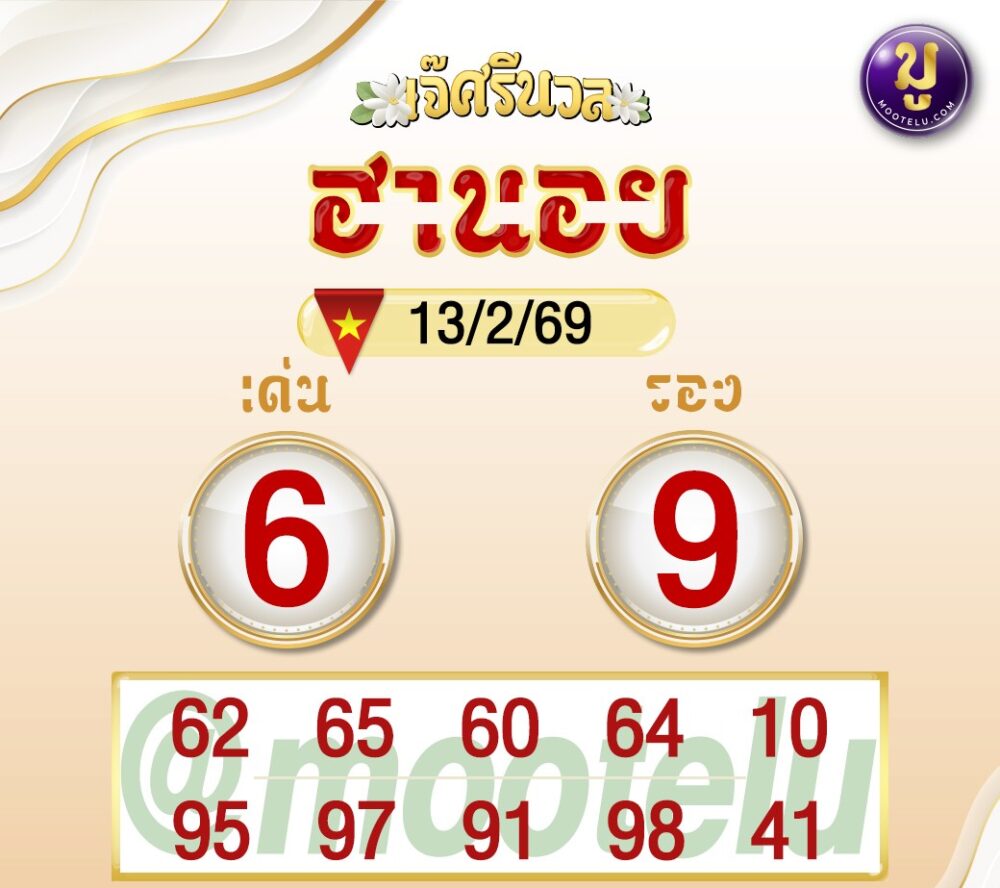 เลขของเจ๊ศรีนวลรอบนี้มาแรงสุด ๆ เพราะ เด่น 6 ชนกับหลายสำนัก ส่วน 9 ที่ให้เป็นเลขรองก็ถือว่าแรงไม่เบา เน้นชุดสวยและมีเลขเบิ้ลผสมให้เลือกหลายตัว
