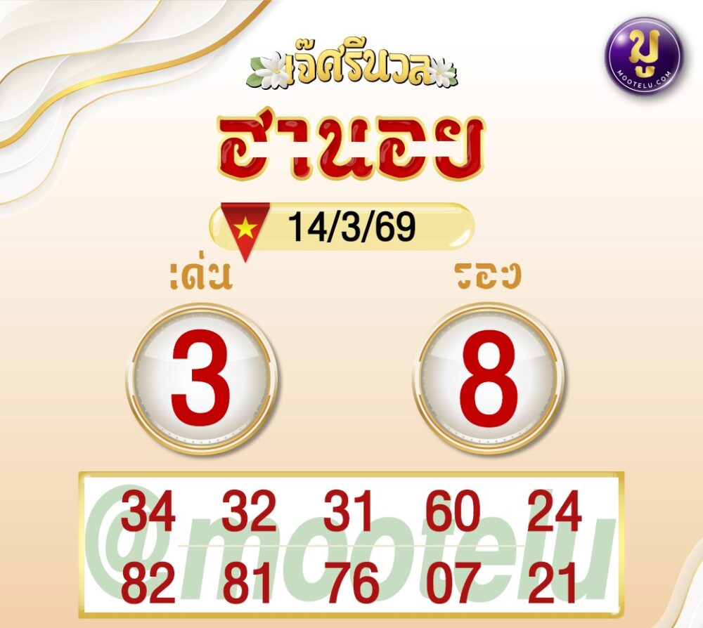 งวด 14/3/69 ภาพรวม แนวทางหวยฮานอยวันนี้ วันนี้เด่นชัดในกลุ่ม 5 – 7 – 6 – 1 – 3 – 8 โดยเฉพาะเลข 5 และ 7 จากแม่นิราศินี ขณะที่เลข 6 และ 1 มาแรงจากอาจารย์ศรราม และเลข 3–8 เสริมเกมจากเจ๊ศรีนวล ทำให้งวดนี้เป็นศึกเลขกลาง–ปลายค่อนข้างครบทุกทาง บ้านกีฬาสรุปเลขชน จัดโพยให้เรียบร้อยค่ะ