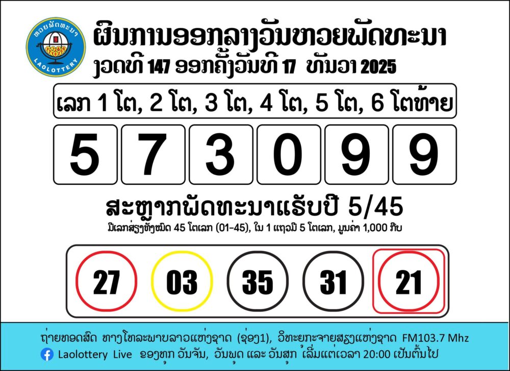 ຖ່າຍທອດສົດການອອກເລກລາງວັນຫວຍພັດທະນາ 17/12/2025