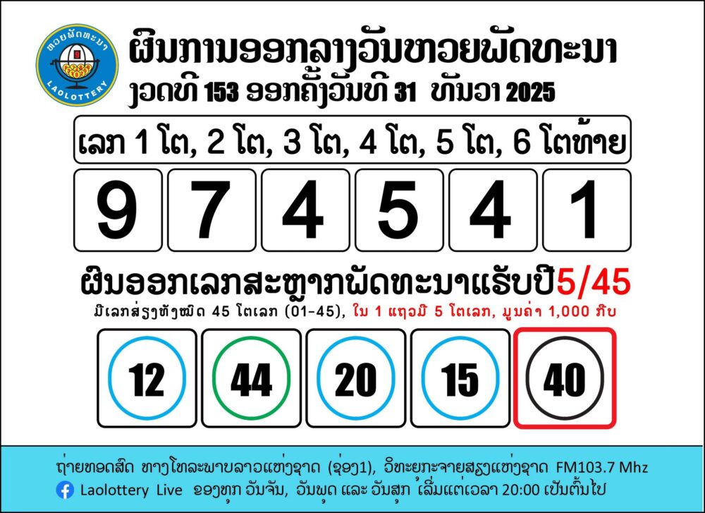 ຖ່າຍທອດສົດການອອກເລກລາງວັນຫວຍພັດທະນາ 31/12/2025