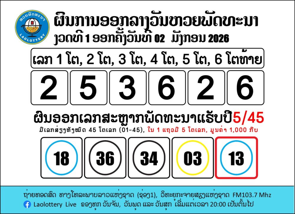 ຖ່າຍທອດສົດການອອກເລກລາງວັນຫວຍພັດທະນາ 2/1/2569