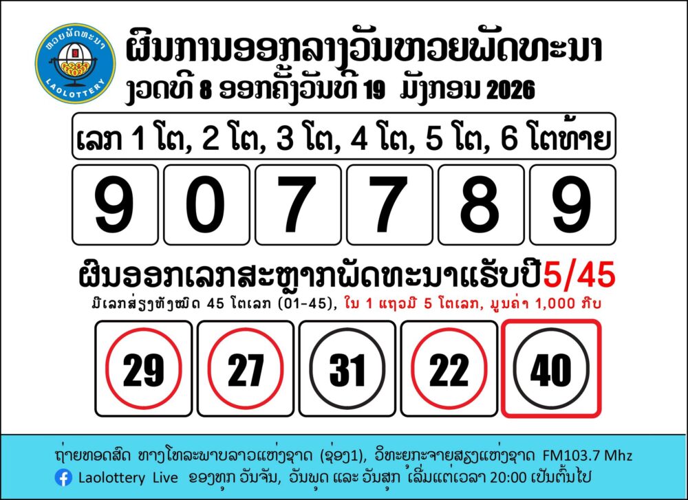 ตรวจหวยลาว (ຫວຍລາວ) งวดประจำวันที่ 19/1/69