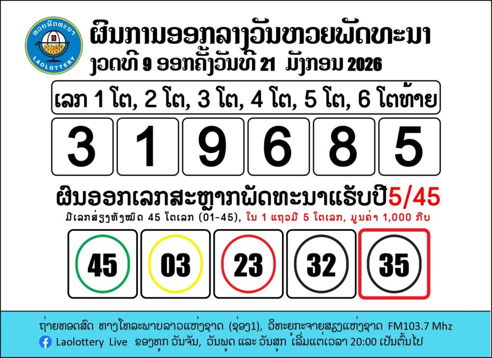 ดูถ่ายทอดสด หวยลาววันนี้ ຫວຍລາວ งวด 21/1/69