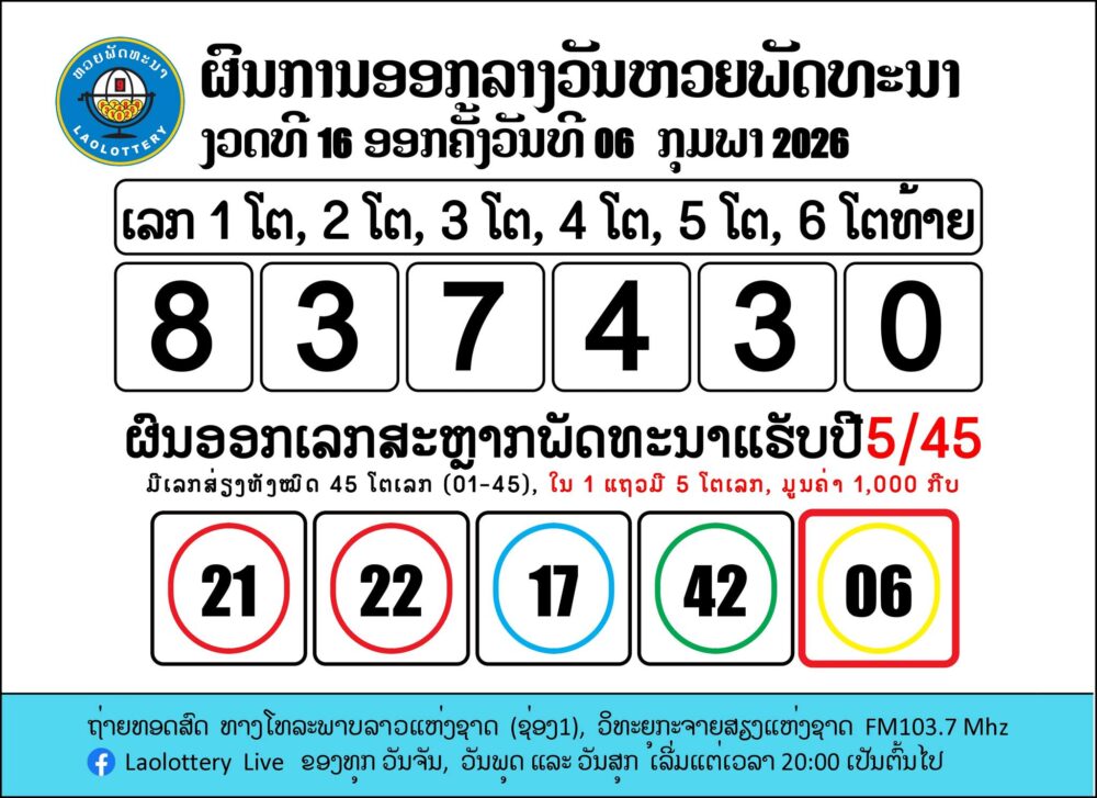 ตรวจหวยลาว (ຫວຍລາວ) งวดประจำวันที่ 6 กุมภาพันธ์ 2569