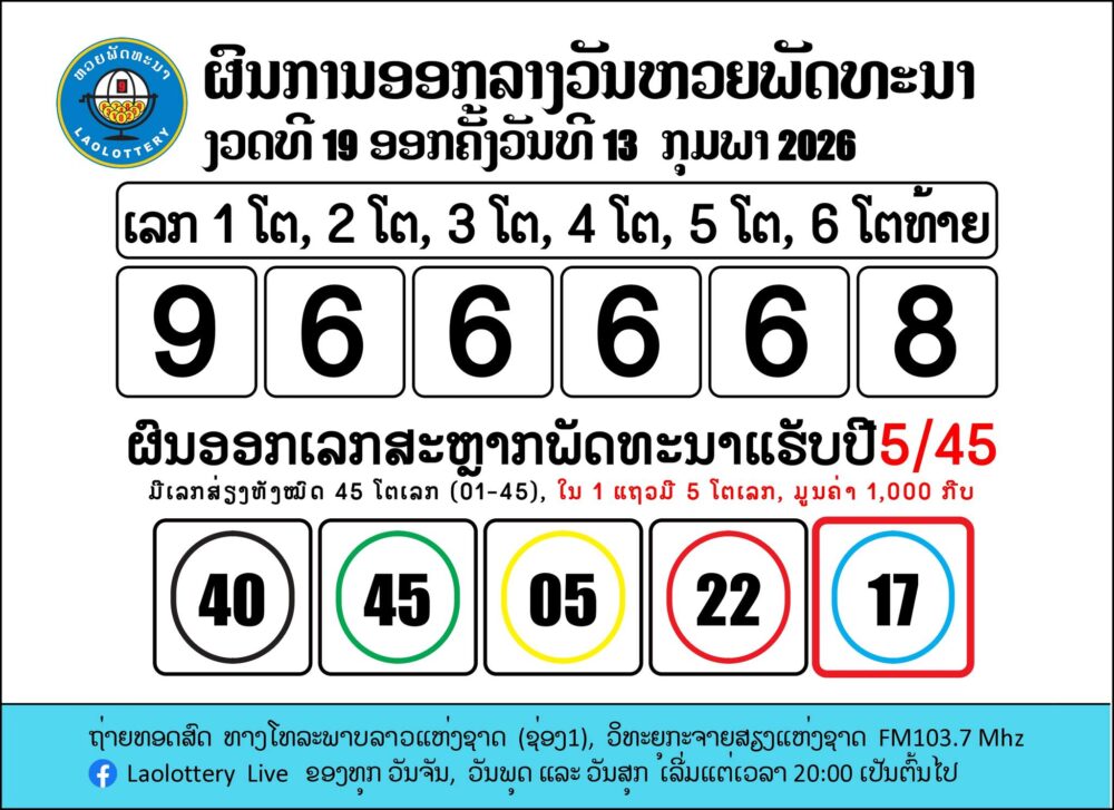 ตรวจหวยลาว (ຫວຍລາວ) งวดประจำวันที่ 13 กุมภาพันธ์ 2569