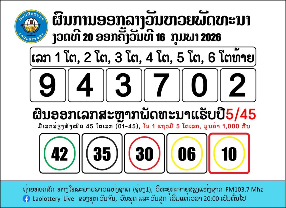 ตรวจหวยลาว (ຫວຍລາວ) งวดประจำวันที่ 16 กุมภาพันธ์ 2569
