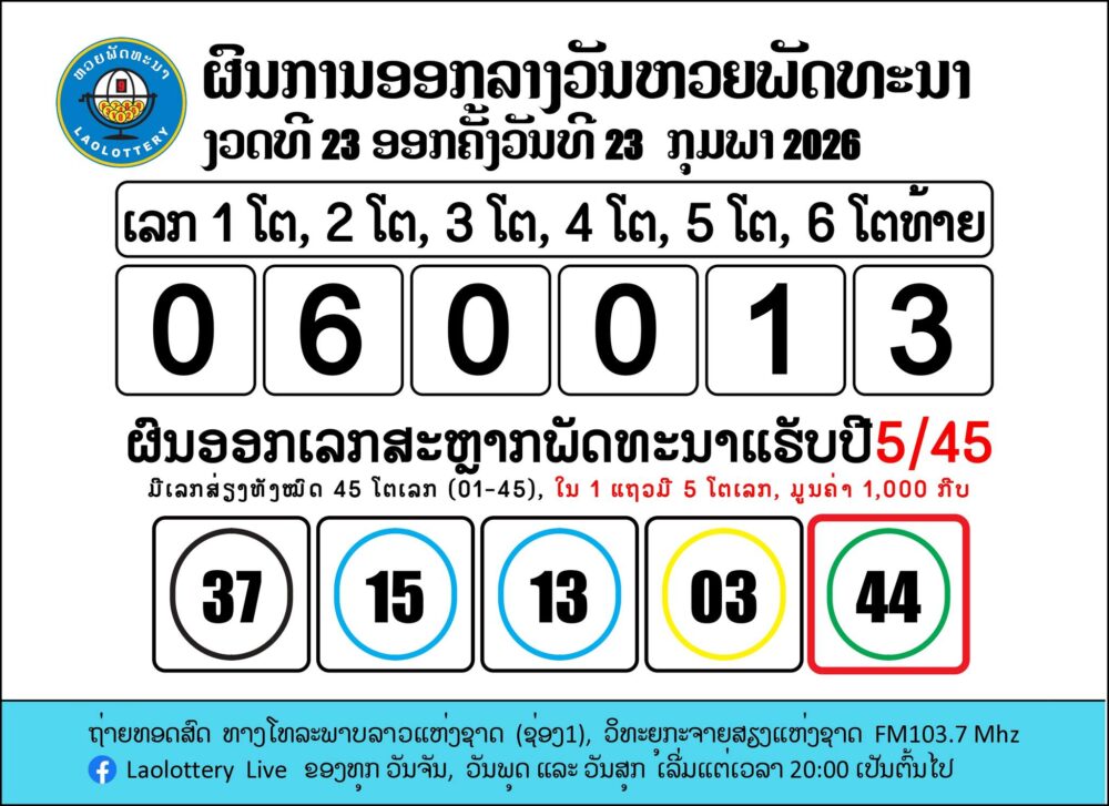 ตรวจหวยลาววันนี้ งวดประจำวันจันทร์ที่ 23 กุมภาพันธ์ 2569