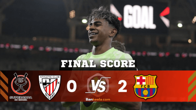 นาทีที่ 90+3: จบเกมการแข่งขัน บาร์เซโลน่าชนะ แอธเลติก บิลเบา 2-0 ผ่านเข้าสู่รอบชิงชนะเลิศของแปนิชซูเปอร์คัพ 2024