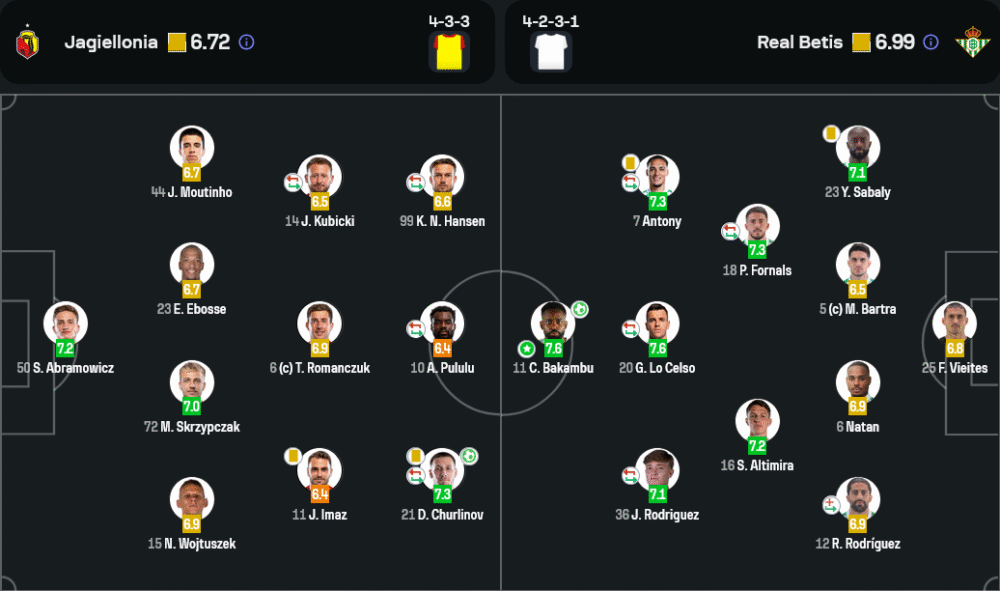 รูปเกมโดยรวม เรอัล เบติสมาในแผน 4-2-3-1 ที่เน้นการครองบอลและคุมแดนกลางอย่างแข็งแกร่ง ใช้การเจาะริมเส้นและการซ้อนเติมของโล เซลโซกับฟอร์นาลส์ได้อย่างมีประสิทธิภาพ ด้านจาเกียลโลเนียแม้มาเน้นเกมรับด้วยแผน 4-3-3 และมีวินัยสูง แต่ก็มีปัญหาเรื่องการเปลี่ยนจากรับเป็นรุกที่ไม่ไหลลื่นพอ บ้านกีฬาวิเคราะห์ในเชิง วิเคราะห์บอล ว่าเบติสมีระบบการผ่านบอลและการเคลื่อนที่ที่เฉียบคมกว่า แต่ความเด็ดขาดหน้าประตูยังต้องปรับปรุงหากหวังไปให้ไกลกว่านี้ในรอบรองฯ