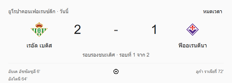 เบติสเชือดฟิออเรนติน่า! เปิดรังทุบ 2-1 ตุนความได้เปรียบก่อนนัดสองศึกยูฟ่าคอนเฟอเรนซ์ลีก