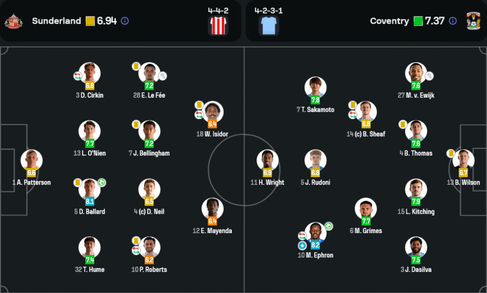 🟨 68’ – จู๊ด เบลลิงแฮม (ซันเดอร์แลนด์) และ เบน วิลสัน (โคเวนทรี) ปะทะกัน