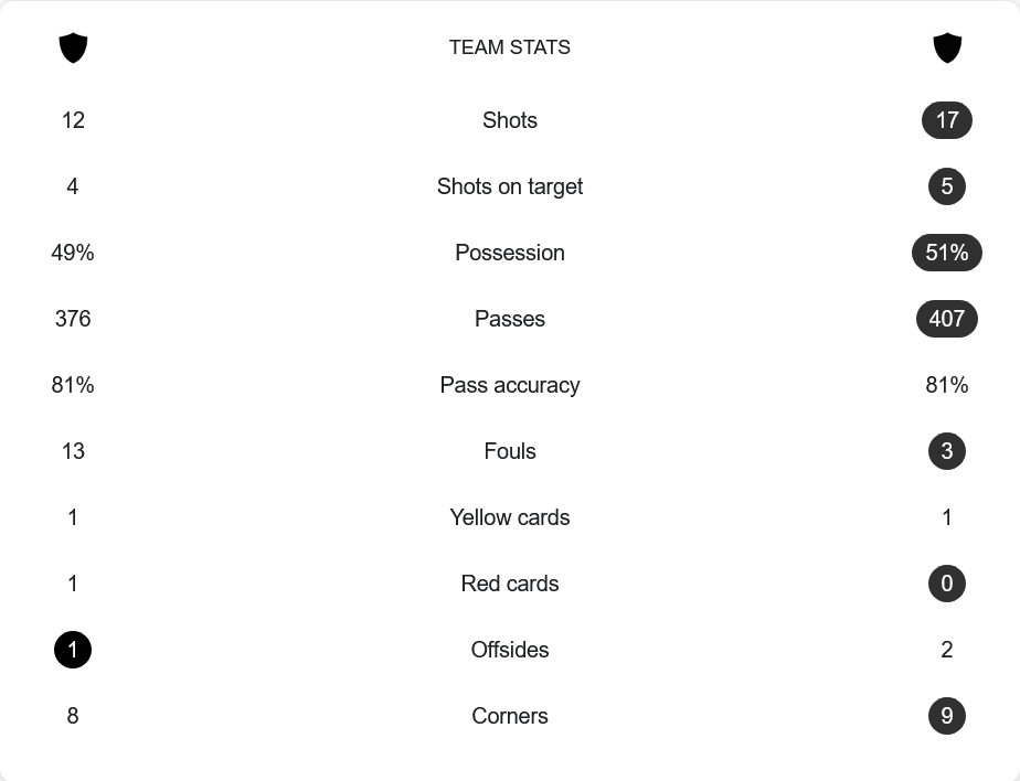 สถิติหลังเกมแสดงให้เห็นว่าวีพีเอสครองบอลได้เพียง 49% ยิงไป 12 ครั้ง เข้ากรอบ 4 ส่วนฮาก้าครองบอล 51% ยิงมากกว่า 17 ครั้ง เข้ากรอบ 5 ทั้งคู่มีความแม่นยำในการจ่ายบอลเท่ากันที่ 81% แต่วีพีเอสเสียเปรียบตรงฟาล์วเยอะกว่าและถูกใบแดงในช่วงท้าย