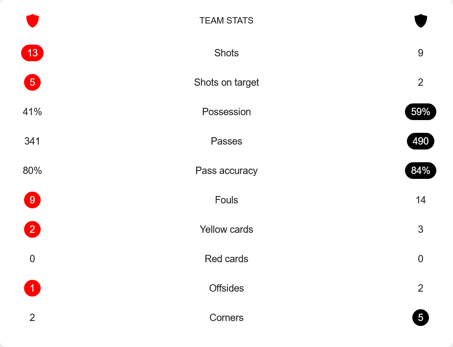 เกมนี้เซนต์ แพตทริคส์มีโอกาสยิงทั้งหมด 13 ครั้ง เข้ากรอบ 5 ครั้ง ครองบอล 41% ด้วยการผ่านบอล 341 ครั้งและความแม่นยำ 80% ส่วนโบฮีเมี่ยนส์มีโอกาสยิง 9 ครั้ง เข้ากรอบ 2 ครั้ง ครองบอลมากกว่า 59% ผ่านบอล 490 ครั้งและแม่นยำกว่า 84% ฟาวล์รวมกันสูงถึง 23 ครั้ง โดยโบฮีเมี่ยนส์ได้เตะมุมมากกว่า 5 ครั้งเทียบกับเจ้าบ้าน 2 ครั้ง