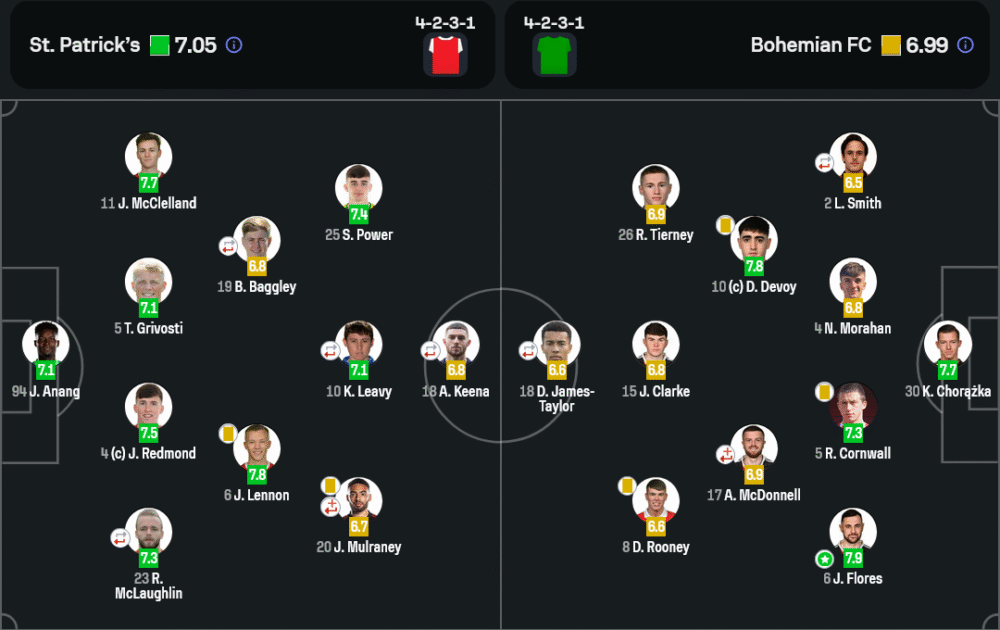 เกมนี้ทั้งสองทีมมาในแผน 4-2-3-1 โดย เซนต์ แพตทริคส์ เน้นการบุกด้วยความเร็วและการโจมตีริมเส้นเป็นหลัก ใช้จังหวะสวนกลับเร็วและครองแดนกลางได้ดีช่วงต้นเกม แต่ความแม่นยำในจังหวะสุดท้ายยังไม่เด็ดขาดนัก ด้าน โบฮีเมี่ยนส์ ครองบอลได้มากกว่าในครึ่งหลัง และพยายามเจาะตรงกลางด้วยการประสานงานของเดวอยกับฟลอเรส แต่ติดแนวรับเจ้าบ้านที่มีวินัยสูง การป้องกันของทั้งสองทีมทำได้ยอดเยี่ยมในเกมนี้ จึงเป็นผลเสมอที่สะท้อนเกมรับที่แข็งแกร่ง บ้านกีฬา มองว่าเป็นอีกหนึ่งแมตช์ที่แฟนบอลสาย วิเคราะห์บอล ควรศึกษาแท็คติกเกมรับ