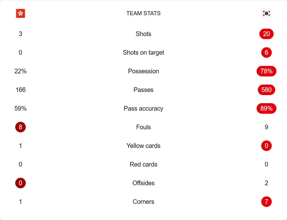 ตลอด 90 นาที เกาหลีใต้เหนือกว่าทุกมิติ ครองบอลสูงถึง 78% เทียบกับฮ่องกงเพียง 22% จ่ายบอลมากกว่าถึง 580 ต่อ 166 ครั้ง และจ่ายแม่นกว่า 89% ต่อ 59% มีโอกาสยิง 20 ครั้ง ตรงกรอบ 6 ครั้ง ขณะที่ฮ่องกงยิงเพียง 3 ครั้งไม่ตรงกรอบแม้แต่หนเดียว ทั้งคู่ฟาวล์พอๆ กัน แต่ฮ่องกงเสียใบเหลืองหนึ่งใบ และได้ลูกเตะมุมแค่ครั้งเดียว เทียบกับเกาหลีใต้ 7 ครั้ง