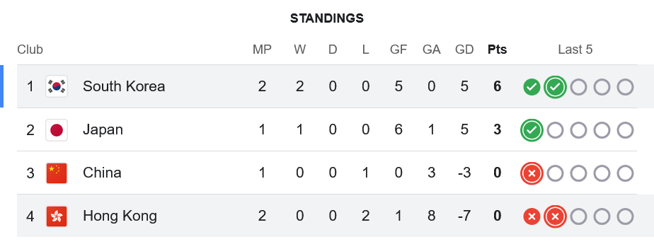 หลังเกมนี้ เกาหลีใต้เก็บ 6 แต้มเต็มจาก 2 นัด รั้งจ่าฝูงแบบไม่ต้องลุ้น ขณะที่ฮ่องกงแพ้รวด 2 นัด หล่นไปอยู่ท้ายตารางแบบหมดลุ้นแชมป์เรียบร้อย