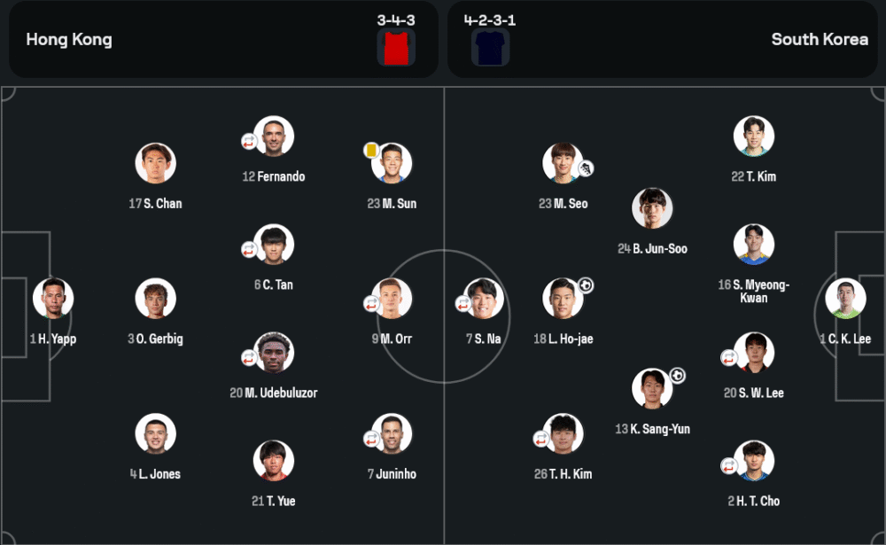 ฮ่องกง: เฟอร์นานโด ออก วาย วอง (46’), คาลวิน ตัน ออก เชือค ปาน งัน (63’), มิเกล อูเดบูลูซอร์ ออก คา-คิว เลา (73’), มาร์คัส ออร์ ออก ฟิลิป ชาน (83’), จูนิญโญ่ ออก เมเดยรอส (83’)