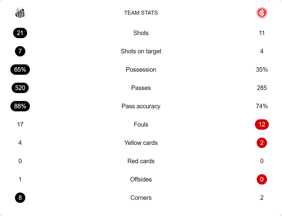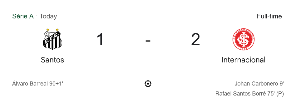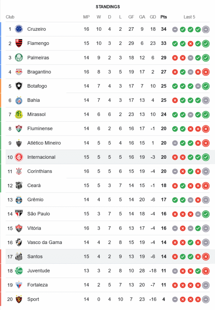 ชัยชนะในเกมนี้ทำให้ อินเตอร์นาซิอองนาล เก็บเพิ่มเป็น 20 แต้มจาก 15 นัด ขยับขึ้นมารั้งอันดับ 10 อย่างเหนียวแน่น ส่วน ซานโตส ยังจมโซนตกชั้นอันดับ 17 มีเพียง 14 แต้มจาก 15 นัด โดยมีสถิติแพ้ 9 จาก 15 นัด ซึ่งถือเป็นสัญญาณอันตรายสำหรับทีมเก่าแก่แห่งลีกบราซิล