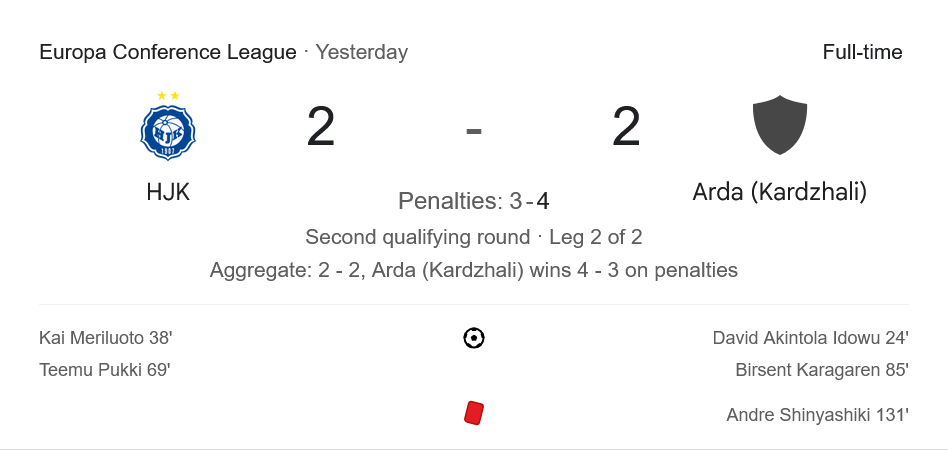 ศึกยูฟ่า ยูโรปาคอนเฟอเรนซ์ลีก รอบคัดเลือก รอบสอง นัดที่สอง ที่สนามของ HJK เฮลซิงกิ จบลงด้วยดราม่าสุดระทึก เมื่อทีมเยือนจากบัลแกเรียอย่าง อาร์ดา คาร์ดซาลี บุกมายันเสมอในเวลา 120 นาที 2-2 ก่อนที่ในช่วงดวลจุดโทษจะเฉือนชนะไป 4-3 ส่งผลให้ผลรวมสองนัดเสมอกัน 2-2 แต่เป็นอาร์ดาที่เข้ารอบด้วยผลจุดโทษรวม 4-3 และเขี่ยเจ้าถิ่นตกรอบอย่างเจ็บแสบ ท่ามกลางบรรยากาศตึงเครียดและเร้าใจตลอดเกมนี้