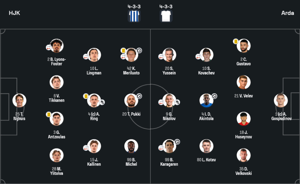 ทั้งสองทีมใช้แผน 4-3-3 ในการจัดทัพโดย HJK ยึดครองบอลและเน้นบุกแบบแม่นยำผ่านการเคลื่อนไหวของ ทีมู ปุ๊กกิ และ เมริลูโอโต ที่คอยเชื่อมเกมจากกลางสนามและซัดจบสกอร์ ส่วนอาร์ดาเน้นเกมสวนกลับจากริมเส้นอันรวดเร็วของ โควาเชฟ และ ยูสเซน ซึ่งสร้างความปั่นป่วนให้แนวรับเจ้าถิ่นอยู่ตลอด