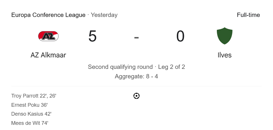 ชัยชนะถล่มทลายของ AZ Alkmaar ในเลกสอง ทำให้พวกเขาผ่านเข้าสู่รอบคัดเลือกถัดไปของยูโรปาคอนเฟอเรนซ์ลีก ด้วยสกอร์รวม 8-4 และรอพบกับ วาดุซ ในวันที่ 8 สิงหาคม ส่วน Ilves ต้องพับแผนยุโรปไว้ชั่วคราว และหันกลับไปมุ่งมั่นกับการแข่งขันในลีกฟินแลนด์ที่ยังมีงานหนักรออยู่