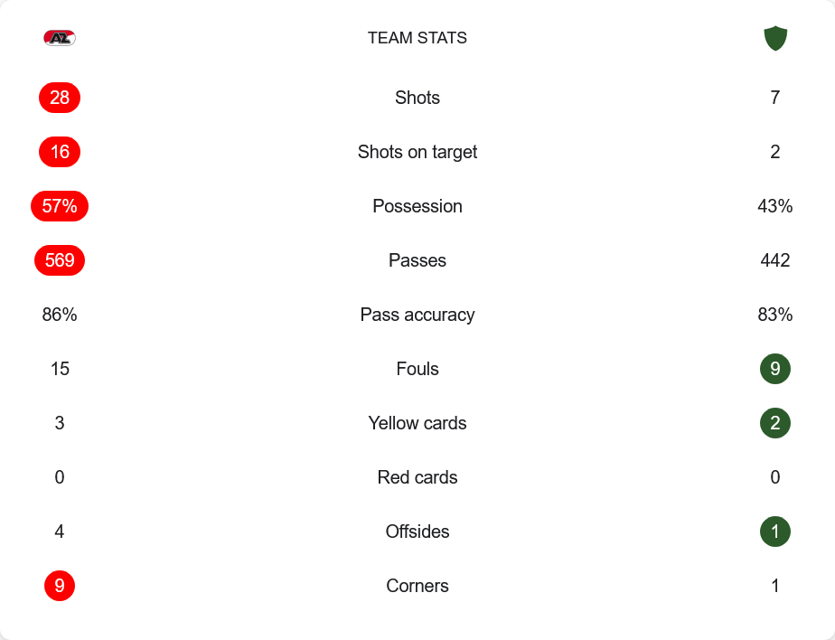 AZ Alkmaar ครองเกมได้เหนือกว่าทุกมิติด้วยเปอร์เซ็นต์การครองบอล 57% สร้างโอกาสยิงถึง 28 ครั้ง เข้ากรอบ 16 ส่วน Ilves ได้ยิงเพียง 7 ครั้งและเข้ากรอบเพียง 2 หน AZ จ่ายบอลสำเร็จถึง 86% เทียบกับ Ilves ที่แม้จะพยายามเซ็ตบอลแต่ทำได้แค่ 83% และจบด้วยความพ่ายแพ้หมดรูป ทั้งจำนวนฟาวล์ ใบเหลือง และเตะมุม ต่างก็สะท้อนให้เห็นว่า Ilves ไม่สามารถตั้งหลักได้เลยตลอดเกมนี้