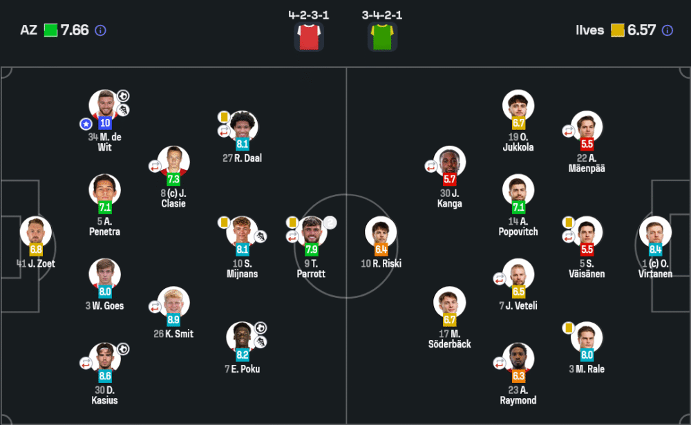 ในขณะที่ Ilves ใช้แผน 3-4-2-1 แต่กลายเป็นว่าถูกตัดการเชื่อมบอลตั้งแต่แดนกลาง ทำให้ไม่สามารถพาบอลขึ้นหน้าได้เลย การตั้งรับในแผงแบ็คทรีไม่มีความแน่นหนาเพียงพอ ทำให้เสียพื้นที่อย่างต่อเนื่อง จังหวะสวนกลับก็แทบไม่ก่ออันตราย วิเคราะห์จากฟอร์มนี้ถือว่า AZ สมบูรณ์แบบทั้งรุกและรับ ขณะที่ Ilves ต้องกลับไปแก้เกมอย่างหนักหากหวังจะกลับมาในเวทียุโรป