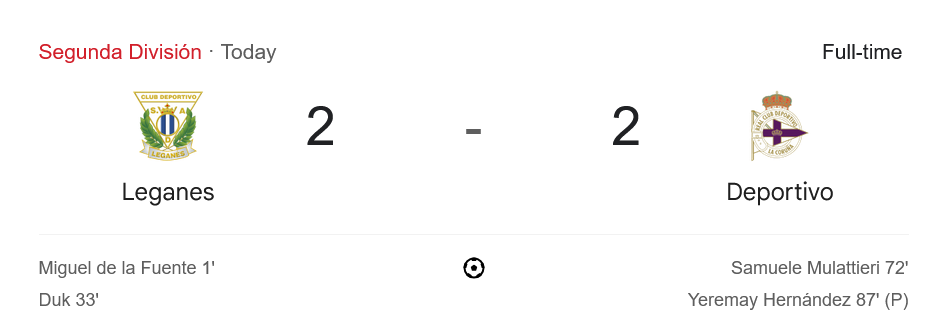 บ้านผลบอล สรุปหลังเกม ศึกเดือดเซกุนด้า! เลกาเนสพลาดท่าช่วงท้าย โดนเดปอร์ติโบ ไล่เจ๊า 2-2 สุดมันส์