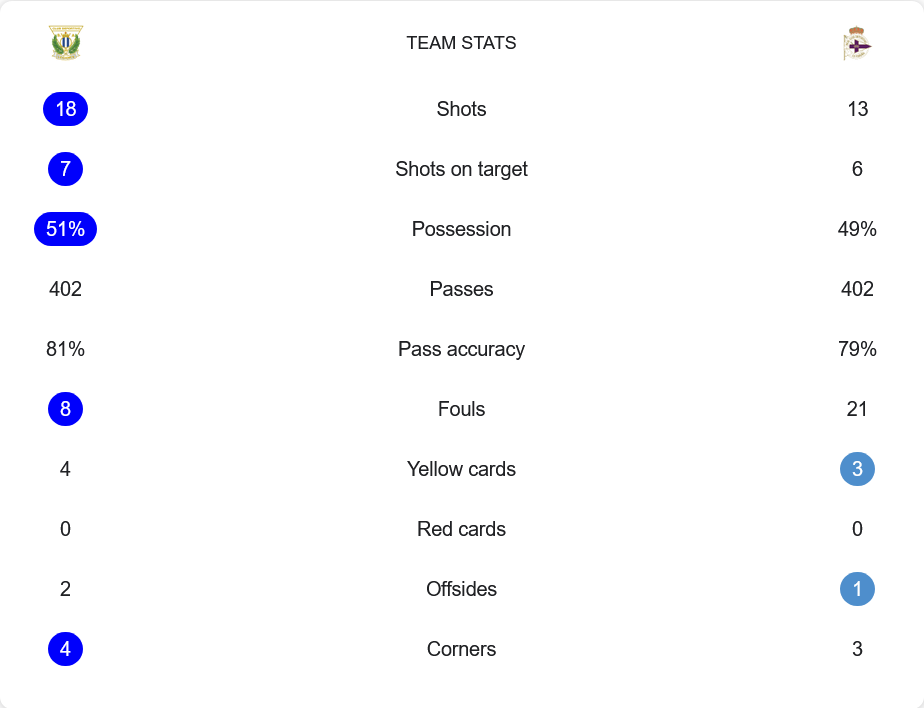 ตัวเลขออกมาสูสี เลกาเนสครองบอล 51% ยิงทั้งหมด 18 ครั้ง เข้ากรอบ 7 ครั้ง ขณะที่เดปอร์ติโบครองบอล 49% ยิง 13 ครั้ง เข้ากรอบ 6 ครั้ง ผ่านบอลเท่ากันฝั่งละ 402 ครั้ง ความแม่นยำใกล้เคียง 81% ต่อ 79% แต่สิ่งที่ต่างคือการเล่นหนัก เดปอร์ติโบฟาวล์ถึง 21 ครั้ง โดนเหลือง 3 ขณะที่เลกาเนสฟาวล์แค่ 8 แต่โดนเหลืองถึง 4 การเล่นแบบบีบพื้นที่หนักของทีมเยือนคือกุญแจที่เปลี่ยนเกม