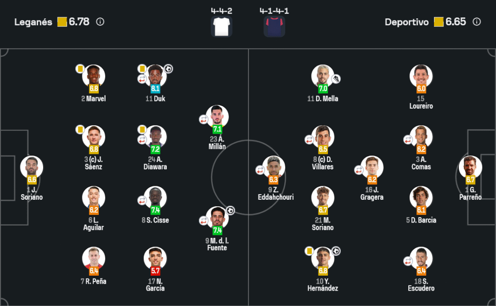 เปลี่ยนตัว: 63’ G. Melero แทน Duk, 63’ J. Cruz แทน Millán, 63’ Ó. Plano แทน Diawara, 78’ D. Garcia แทน M. de la Fuente, 90+4’ C. Guirao แทน S. Cisse