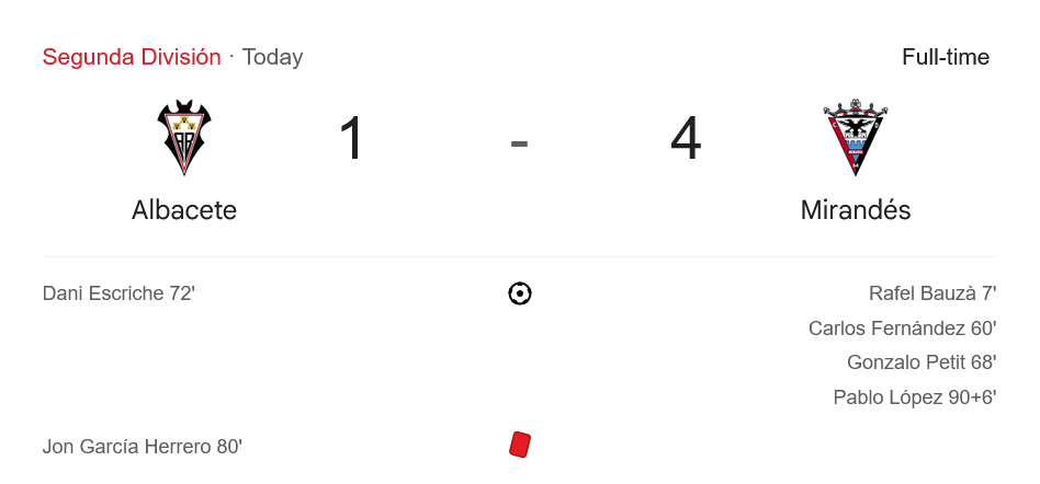 นาทีที่ 60 มิรานเดสหนีห่าง 2-0 จากลูกยิงของ คาร์ลอส เฟร์นานเดซ ที่หาช่องเข้าซัดไม่พลาด ถัดมาเพียง 8 นาที กอนซาโล เปอตีต์ เติมสกอร์ให้ทีมเยือนเป็น 3-0 เกมเหมือนจะปิดกล่อง แต่เจ้าถิ่นอัลบาเซเต้ยังมีฮึด นาที 72 ดานี เอสคริเช ยิงตีไข่แตกเป็น 1-3 ทว่าความหวังต้องพังทลายเมื่อ ฆอน การ์เซีย โดนไล่ออกนาที 80 ส่งผลให้แนวรับรวนหนัก และในช่วงทดเจ็บนาที 90+6 ปาโบล โลเปซ โกเมซ ยิงประตูตอกฝาโลงให้ มิรานเดสถล่มขาดลอย 4-1