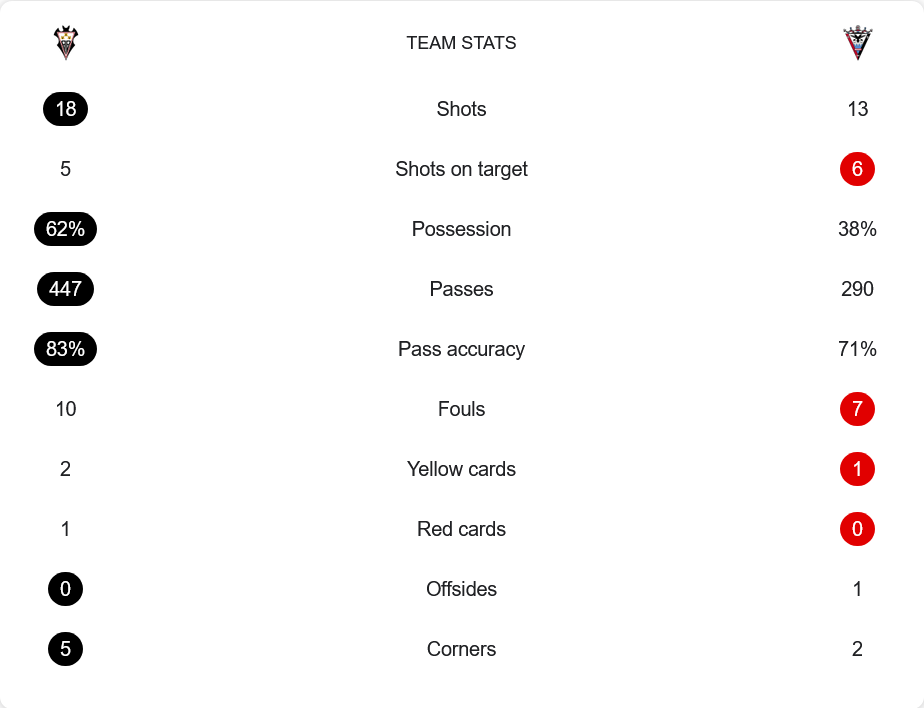 แม้อัลบาเซเต้ครองบอลได้ถึง 62% จ่ายบอลมากกว่า 447 ครั้ง และความแม่นยำสูงถึง 83% แต่กลับสร้างโอกาสยิงตรงกรอบได้เพียง 5 ครั้ง ขณะที่มิรานเดสแม้ครองบอลเพียง 38% แต่ยิงตรงกรอบ 6 ครั้งและเปลี่ยนเป็นประตูถึง 4 ลูก แสดงให้เห็นถึงประสิทธิภาพการเข้าทำที่โหดกว่าอย่างชัดเจน