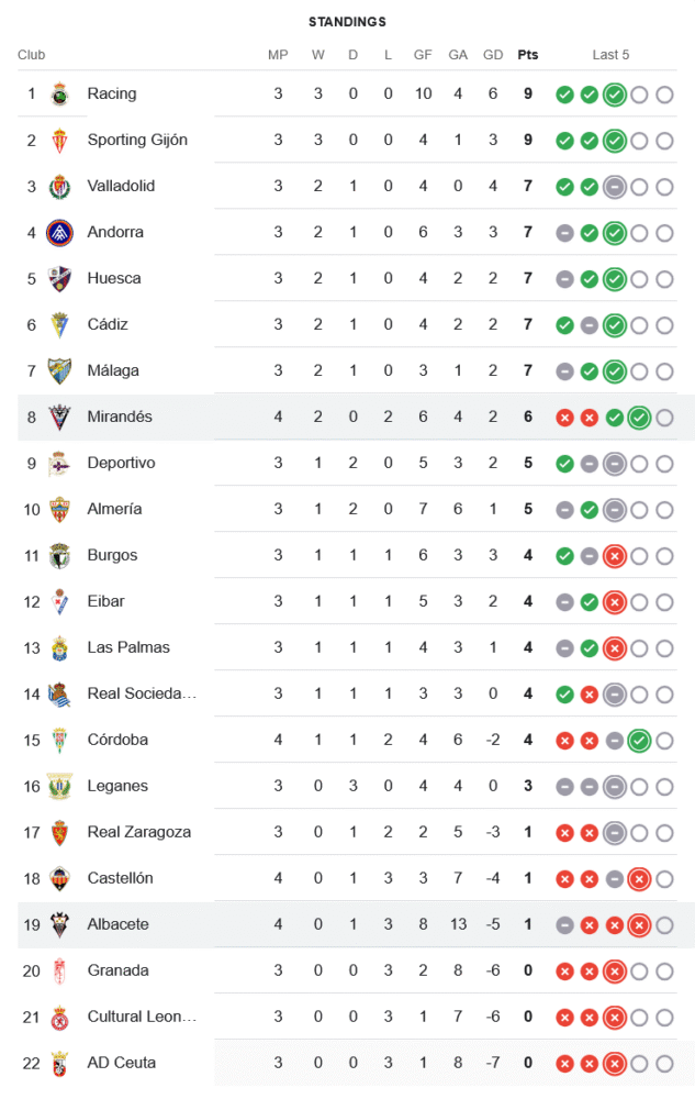 ชัยชนะนัดนี้ทำให้ มิรานเดส เก็บเพิ่มเป็น 6 แต้มจาก 4 นัด ขยับขึ้นกลางตารางที่อันดับ 8 ส่วน อัลบาเซเต้ สถานการณ์น่าเป็นห่วง เก็บได้เพียง 1 แต้มจาก 4 นัด จมโซนตกชั้นอันดับ 19 ความพ่ายแพ้แบบนี้กดดันทีมอย่างหนักในการลุ้นแต้มต่อไป