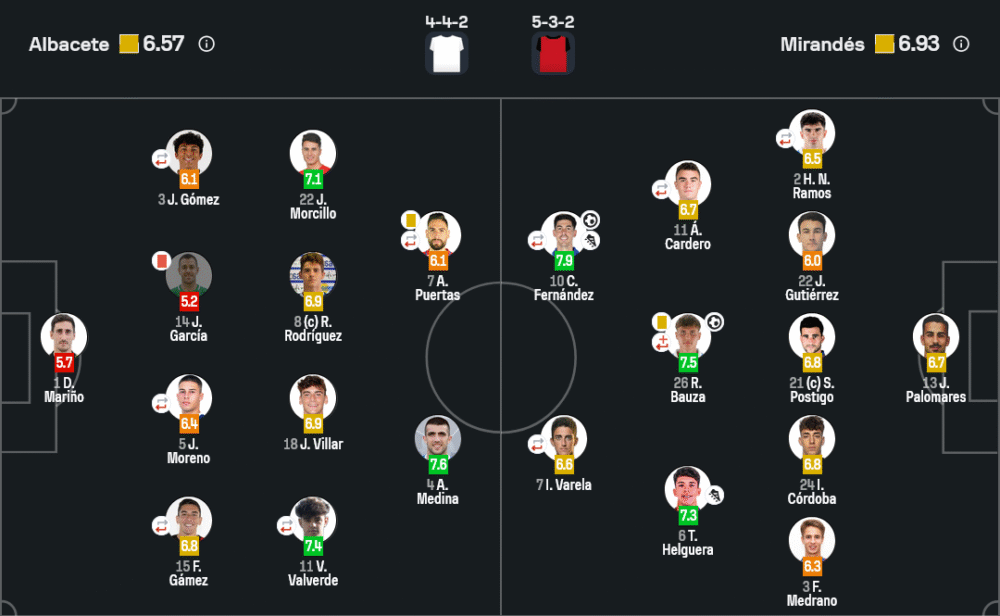 มิรานเดสมาในระบบ 5-3-2 เน้นเกมรัดกุมและสวนกลับเร็ว การเชื่อมเกมจากกลางไปถึงแดนหน้าคมกริบ โดยเฉพาะการเติมของ เฟร์นานเดซ และการจบสกอร์เฉียบคมจากตัวรุก ทำให้เกมบุกหลากหลายและเล่นง่ายขึ้น ส่วนเกมรับแน่นแฟ้น ไม่ปล่อยให้คู่แข่งเจาะได้ง่าย ขณะที่อัลบาเซเต้ในระบบ 4-4-2 แม้จะครองบอลได้มากกว่า แต่เกมรุกไร้ไอเดีย จังหวะสุดท้ายขาดความเฉียบขาด และเมื่อเหลือผู้เล่น 10 คนแนวรับก็พังทันที ถือเป็นบทเรียนใหญ่ในการวิเคราะห์บอลนัดนี้