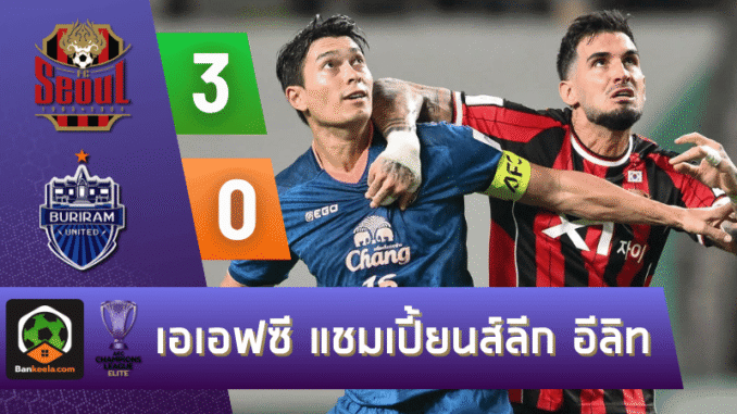 “บ้านกีฬา” รายงาน ผลบอลสด เอเอฟซี แชมเปี้ยนส์ลีก อีลิท จากกรุงโซล—FC Seoul เปิดรังอัด บุรีรัมย์ ยูไนเต็ด 3-0 ด้วยจังหวะคมๆ และวินัยเกมรับแน่นจนทีมไทยแทบหาพื้นที่เจาะไม่ได้ ประตูของ จุน ชเว (38’), ซึงวอน จอง (45+3’) และ ลูคัส ซิลวา (68’) ปิดเกมแบบไร้ข้อกังขา พร้อมตอกย้ำความแข็งแกร่งของตัวริมเส้นเจ้าถิ่นที่ทำลายแนวรับ 3 เซ็นเตอร์ของบุรีรัมย์ตลอด 90 นาที