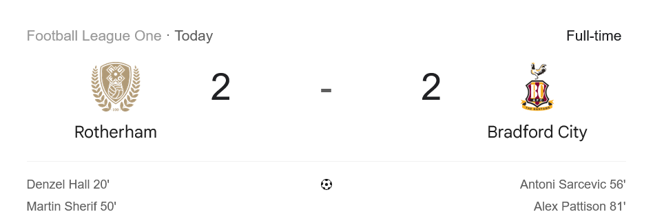 การเสมอครั้งนี้ทำให้ แบรดฟอร์ด ซิตี้ เก็บเพิ่ม 1 แต้ม แต่ยังยึดหัวตารางด้วยฟอร์มสม่ำเสมอ ส่วน ร็อตเธอร์แฮม ยูไนเต็ด ได้เพียงแต้มเดียว ทั้งที่นำ 2-0 โอกาสหนีโซนล่างยังต้องเร่งด่วน ชี้ชัดว่าความนิ่งยามนำคือบทเรียนใหญ่ของพวกเขา