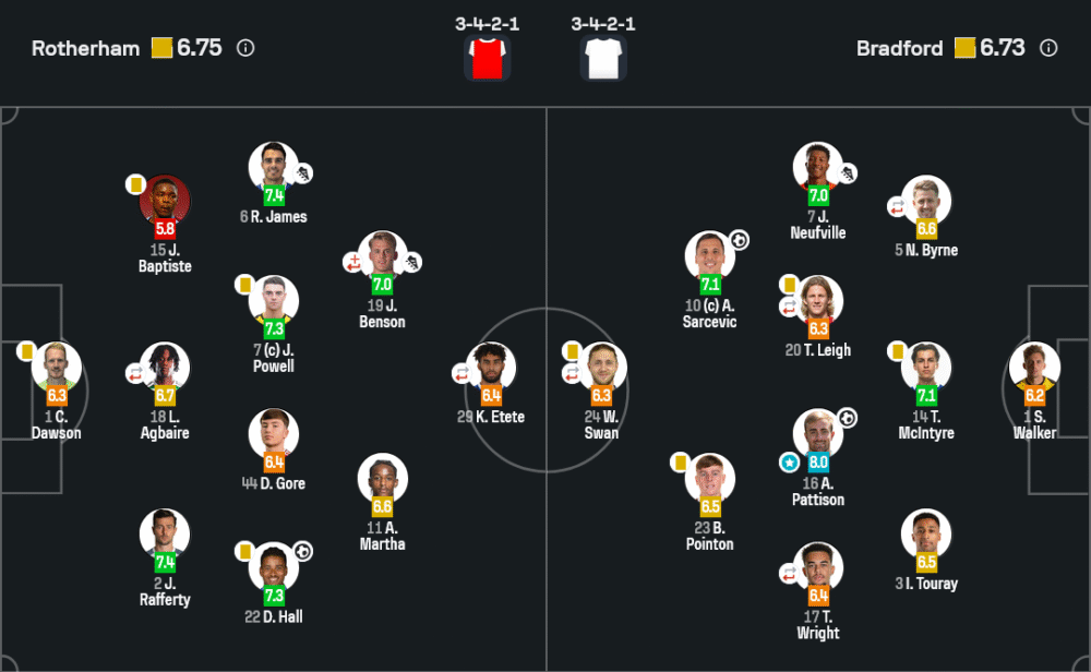 อเล็กซ์ แพตติสัน (Bradford City) – กองกลางพลังม้า ขับเคลื่อนเกมครึ่งหลังจนรูปเกมพลิก สำคัญสุดคือประตูตีเสมอนาที 81 ได้คะแนนสูงสุดราว 8.0 สมราคา “หัวใจคัมแบ็ก” ของจ่าฝูงนัดนี้