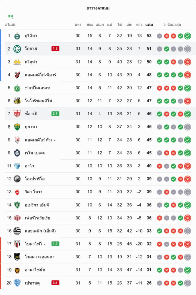 ชัยชนะของ ซีอาร์บี เกมนี้ทำให้พวกเขาขยับขึ้นมาอันดับ 7 มี 46 คะแนน ไล่จี้โซนเลื่อนชั้นเพียงไม่กี่แต้ม ขณะที่ โกยาส ยังคงรั้งอันดับ 2 มี 51 คะแนน พลาดโอกาสเก็บสามแต้มทองเพื่อจี้จ่าฝูงครูซิเฮโร่