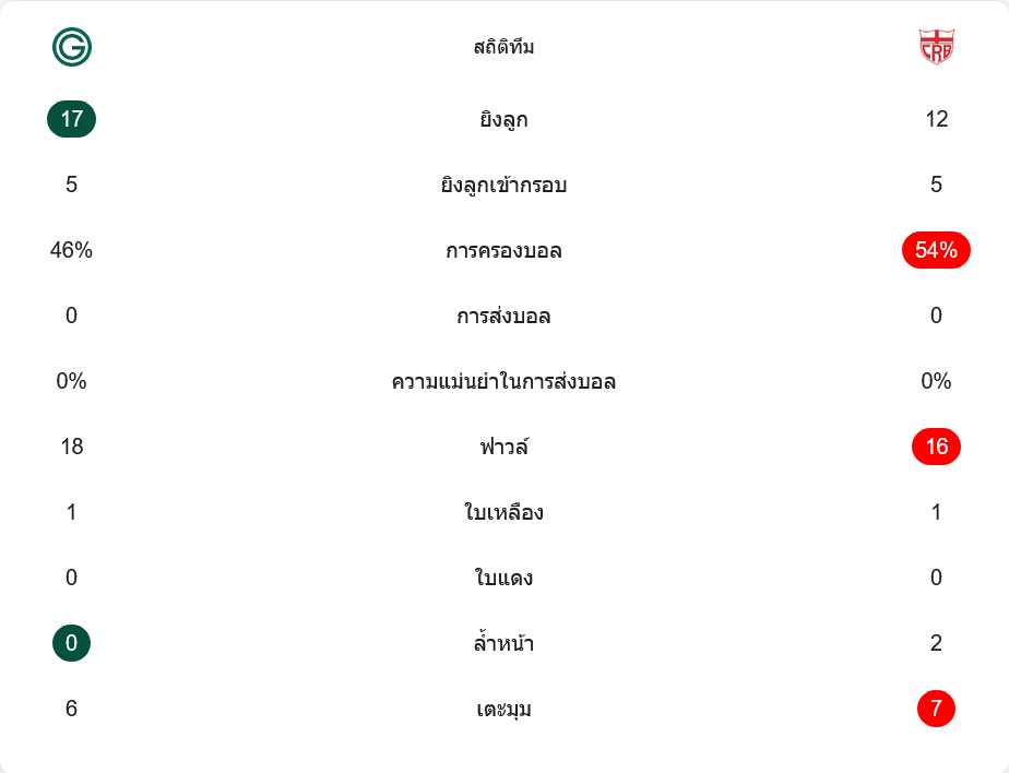 เกมนี้ โกยาส มีโอกาสยิงทั้งหมด 17 ครั้ง เข้ากรอบ 5 ครั้ง ครองบอล 46% ทำฟาวล์ 18 ครั้ง ได้เตะมุม 6 ครั้ง ส่วนทีมเยือน ซีอาร์บี ยิง 12 ครั้ง เข้ากรอบ 5 ครั้ง ครองบอลมากกว่า 54% ฟาวล์ 16 ครั้ง ได้เตะมุม 7 ครั้ง ทั้งสองทีมต่างได้ใบเหลืองทีมละ 1 ใบ และไม่มีใบแดง เกมนี้สะท้อนให้เห็นว่าแม้โกยาสจะบุกมากกว่า แต่ทีมเยือนเล่นเกมสวนกลับได้มีประสิทธิภาพและเฉียบคมกว่า