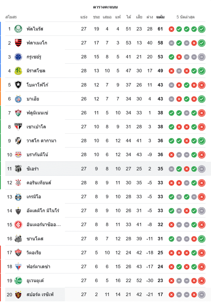 เช็ก ตารางบอล แล้ว สปอร์ต เรซิเฟ่ มีคิวบุกไปเยือน อินเตอร์นาซิอองนาล ในวันที่ 20 ตุลาคม ก่อนจะกลับมาเปิดบ้านรับ มิราสซอล ในวันที่ 26 ตุลาคม ขณะที่ ซิเอร่า จะเปิดบ้านรับ โบตาโฟโก้ ในวันที่ 20 ตุลาคม และไปเยือน แอต. มิไนโร ในวันที่ 26 ตุลาคม ทั้งสองทีมต้องเร่งฟอร์มเพื่อขยับสถานะในตาราง