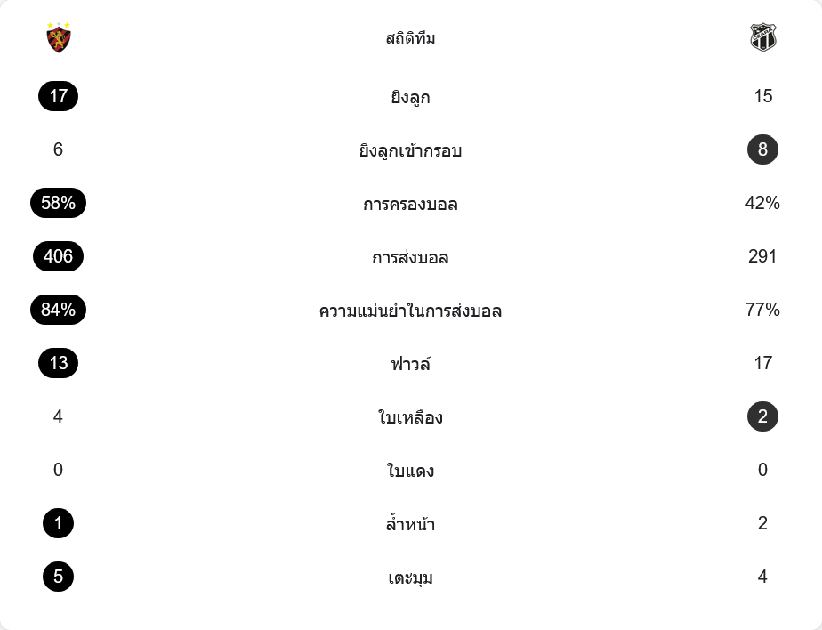- 🔁 73′ สปอร์ต เรซิเฟ่ เปลี่ยน: อิกอร์ คาริอุส แทน ซิลวา, คริสเตียน บาร์เลตต้า แทน มาธิวซินโญ่