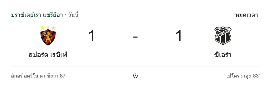 - ⚽ 87′ อิกอร์ คาริอุส ซัดตีเสมอ 1-1 ให้ สปอร์ต เรซิเฟ่