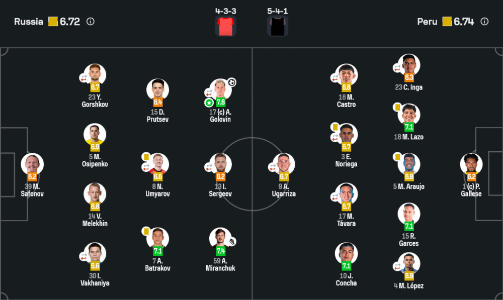 แต่พอเข้าสู่ครึ่งหลัง หลังจากเปลี่ยนตัวชุดใหญ่ในนาที 65 รูปเกมรับของรัสเซียเริ่มมีช่องว่าง การประสานงานระหว่าง ครูโกวอย กับ เมเลคห์กิน ไม่เหนียวแน่นเท่าคู่เดิม ทำให้ช่องว่างระหว่างฟูลแบ็ก–เซ็นเตอร์เปิดกว้างจน เปรู หาจังหวะจู่โจมได้ง่ายขึ้น