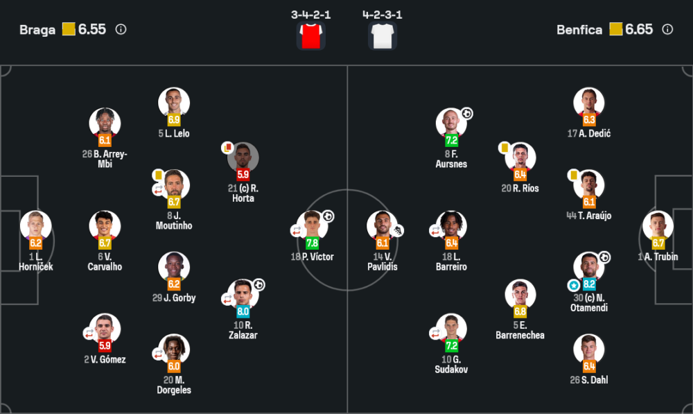 ฝั่งเบนฟิก้าใช้ 4-2-3-1 ชัดเจน วาง บาร์เรเนเชอา คุมจังหวะเกมร่วมกับ บาร์เรโร แล้วให้สามตัวรุกเคลื่อนสลับตำแหน่งตลอดเวลา การขึ้นเกมช่วงต้นครึ่งแรกและต้นครึ่งหลังทำได้ดี โดยเฉพาะฝั่งซ้ายที่ ออร์สนิส กับ ดาห์ล เติมเกมซ้อนกันอย่างมีวินัย พาฟลิดิส ถูกใช้เป็นตัวพักบอล ลากกองหลังบราก้าออกจากตำแหน่งก่อนจ่ายต่อให้เพื่อนเติมยิง