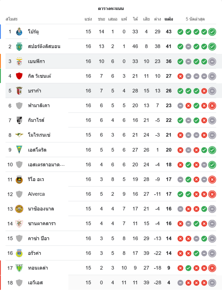 ด้านบราก้าเก็บเพิ่มเป็น 26 คะแนนจาก 16 นัด รั้งอันดับ 5 ไล่จี้กิมาไรส์ที่มี 27 คะแนนแบบกระชั้น พื้นที่ยุโรปยังเปิดกว้าง หากแก้ปัญหาเกมรับหลุดสมาธิและลดจำนวนใบเหลือง–ใบแดงได้ โอกาสขยับขึ้นไปเบียดแถวท็อปโฟร์ยังสดใส