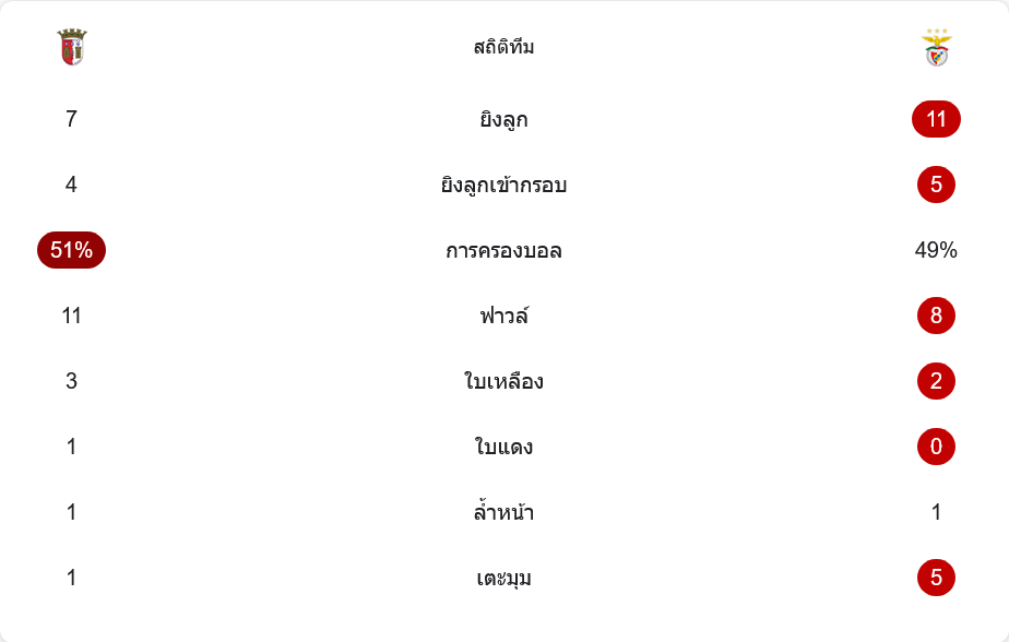 เมื่อมองจากตัวเลขสถิติ จะเห็นว่าเกมนี้สูสีและเปิดหน้าแลกกันตลอด 90 นาที บราก้ามีโอกาสยิงทั้งหมด 7 ครั้ง เข้ากรอบ 4 ส่วนเบนฟิก้าลุยหนักกว่าด้วยการกดไป 11 ครั้ง เข้ากรอบ 5 ทั้งคู่ครองบอลแทบเท่ากัน เจ้าบ้าน 51% ทีมเยือน 49% แปลว่าไม่ได้มีฝ่ายไหนถอยไปตั้งรับอย่างเดียวเลย เกมกลางสนามมีการปะทะกันบ่อย ฟาวล์ของบราก้า 11 ครั้ง เบนฟิก้า 8 ครั้ง การ์ดเหลืองออกมาฝั่งละหลายใบ บราก้าโดน 3 ใบ แถมใบแดงของฮอร์ต้า ส่วนเบนฟิก้าโดนเหลือง 2 ใบ ในมุมลูกตั้งเตะ ทีมเยือนกดเตะมุมไปถึง 5 ครั้ง ขณะที่บราก้าได้เพียง 1 ครั้ง แต่ก็ยังอาศัยความคมในจังหวะสำคัญเก็บหนึ่งแต้มไว้ได้