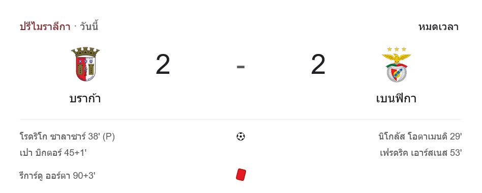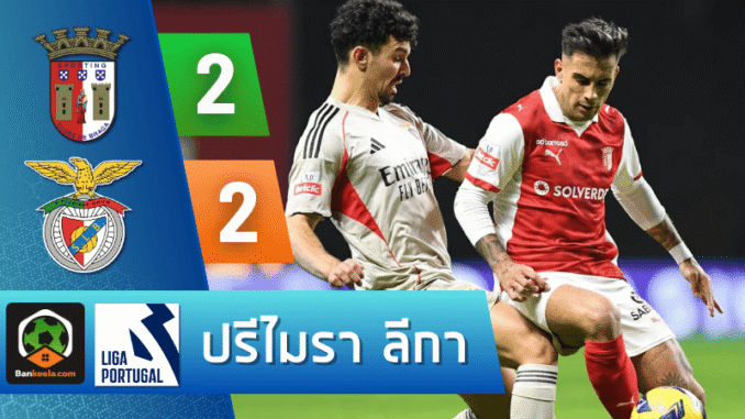 ศึกปรีไมราลีกา คู่ใหญ่ประจำสัปดาห์ สปอร์ติ้ง บราก้า เปิดบ้านรับการมาเยือนของเบนฟิก้า กลายเป็นเกมที่แฟนเช็กสกอร์ผ่าน ผลบอลสด ต้องเฝ้าหน้าจอจนจบนาทีสุดท้าย ทั้งประตูทั้งการ์ดปลิวกันยับ ก่อนจบลงด้วยผลเสมอ 2-2 แบบมีประเด็นให้คุยกันอีกยาว