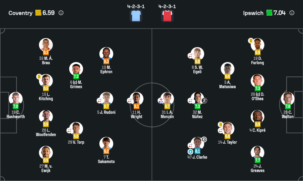 ด้าน อิปสวิช เลือกเกมรับที่มีวินัยสูง ไล่บีบพื้นที่กลางให้โคเวนทรีเล่นลำบาก แล้วรอจังหวะเปลี่ยนจากรับเป็นรุกด้วยการออกบอลแรกจากมาตูซิว่าไปถึงนูนเญซ ก่อนที่เพลย์เมกเกอร์ชาวละตินจะใช้การจ่ายคิลเลอร์พาสฉีกแนวรับจ่าฝูงออกเป็นริ้ว ๆ ทำให้ตัวริมเส้นอย่างคลาร์กและเบิร์นส์มีพื้นที่เล่นดวลหนึ่งต่อหนึ่งอยู่ตลอด