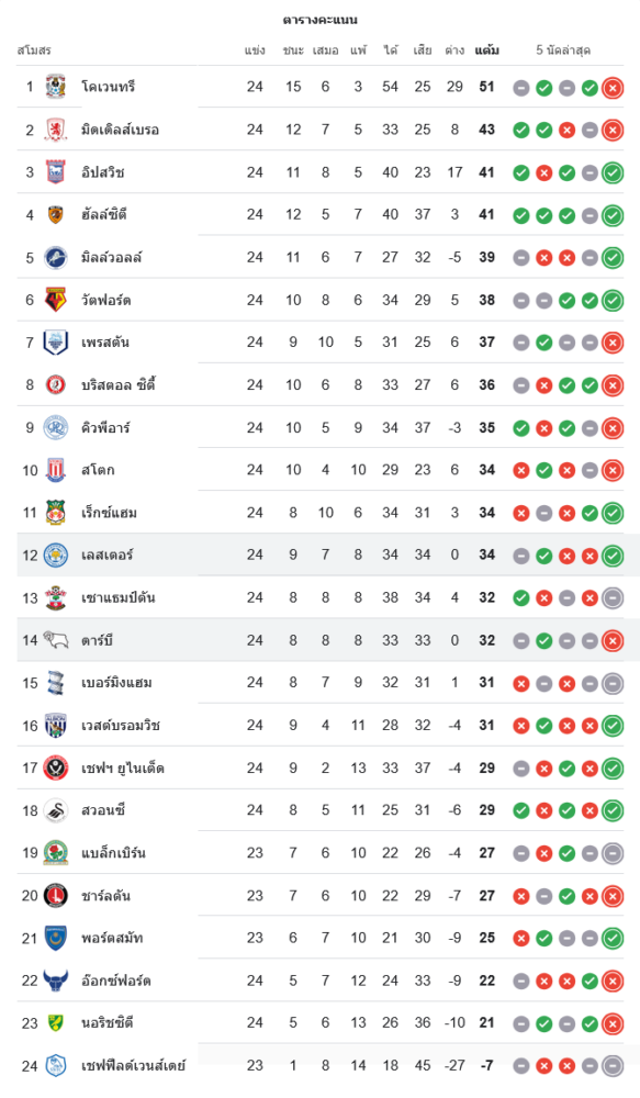 ส่วนดาร์บี้ เค้าท์ตี้ หล่นไปอยู่กลางตารางตอนล่างที่อันดับ 14 แข่ง 24 นัด ชนะ 8 เสมอ 8 แพ้ 8 ยิงได้ 33 เสีย 33 ผลต่างประตูได้เสีย 0 และมี 32 คะแนน สถิติ 8-8-8 ที่ดูสมดุลเกินไปสะท้อนชัดว่าทีมยังขาดความคงเส้นคงวา หากอยากลุ้นพื้นที่เพลย์ออฟ พวกเขาจำเป็นต้องเร่งเก็บชัยชนะให้มากกว่านี้โดยเฉพาะเวลาเจอทีมกลุ่มกลางตารางด้วยกันเอง